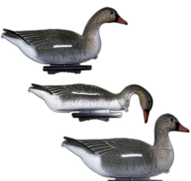 Плавающие чучела гуся гуменника FLFO 950. Цена за набор из 6 шт. Комплект состоит из 6 плавающих чучел гуменника в 3 позах: 2 штуки с вертикальными головами (отдыхающий), 2 штуки в вытянутыми вперед головами (плывущий) и 2 штуки с наклоненными к воде головами (кормящийся). Данная модель предназначена для иммитации плавающей стаи гуменников и устанавливаете на воду (на озерах, реках, болотах, в лужах на полях). Материал - твердый не сминаемый пластик. Чучела полнокорпусные, объемные, с килем. Качественная и реалистичная покраска матовой, не бликующей краской, с рифленной поверхностью и детальная прорисовка пера. Форма и размер реального гуся. Прочные, долговечные. Имеется утяжеленный киль, придающий отличную устойчивость на воде, даже при значительном ветре. В передней и задней части чучела, а так же в киле предусмотрены отверстия для крепления шнура. Длина чучел от кончика клюва до хвоста: плывущий - 70 см, отдыхающий - 63 см. Вес одного чучела - 1000-1150 грамм.