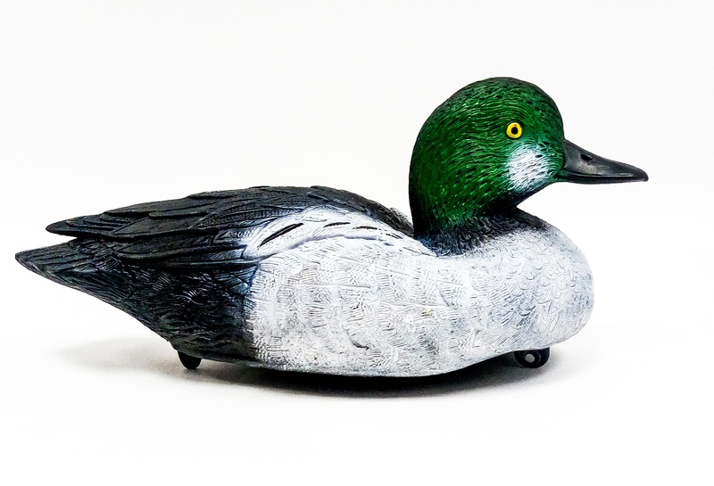 Чучело "Гоголь" (селезень) сминающееся. Активная поза - голова в вертикальном положении. Чучело плавающее, бескилевое, сминающееся. Предназначено для установки на воду или на берег водоема для подманивания уток на охоте или в декоративных целях (украшение пруда). Плавание на воде осуществляется за счет воздушной подушки под дном изделия. Снизу чучалки имеется оригинальный клапан для закачивания и спускания воздуха, который так же препятствует поступлению воды внутрь чучела. Выступающая круглая часть дна должна быть утоплена внутрь изделия. Это обеспечивает надежную устойчивость на воде. Отсутствие киля и плоское основание позволяет установливать данные чучела на землю. Чучела изготовлены из пластизоля ПВХ (резина). Чучело мягкое на ощупь и легко сминается, что значительно уменьшает размеры чучела при транспортировке. В смятом виде займет места в 2 раза меньше чем аналогичные чучела из пластика. "Живая" реалистичная покраска, которая не бликует, не выгорает на солнце и не трескается при скручивании. В передней части основания чучела имеется кольцо для подвязки шнура. При попадании дроби - держатся на плаву. Вес чучела - 360 грамм. Размеры чучела (д*ш*в): 37х15х16 см.