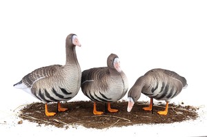 Ультралегкие полнокорпусные сминаемые чучела белолобого гуся серии 3D. Артикул B622-3D. Комплект из 10 шт. Комплектность: 6 кормящихся + 2 отдыхающих + 2 сторожевых. Исполнение МТ ("Антиблик"). Оранжевые съемные лапки (2 шт.). Стеклопластиковая стойка (60 см). Вес комплекта брутто 2,15 кг.
