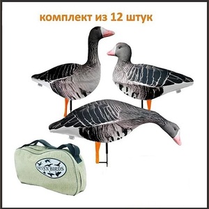 Комплект состоит из 12 чучел белолобого гуся: 6 кормящихся, 4 отдыхающих и 2 сторожевых. Также в комплекте 12 металлических стоек для установки и сумка для транспортировки и хранения (на 12 чучел). Вес 1 чучела без стойки: 400-450 грамм. Длина стойки - 34 см. Вес стойки - 80 грамм. Габариты комплекта в сумке: 70х40х15 см. Вес комплекта в сумке - 5700 грамм. Габаритные размеры 1-го чучела без стойки: кормящийся - 67х20х20 см, сторожевой - 62х20х45 см, отдыхающий - 53х20х35 см (размеры могут незначительно отличаться в зависимости от точек замера). Для стоек предусмотрен специальный чехол. Сумка на молнии с ручками и регулируемым по длине плечевым ремнем.
