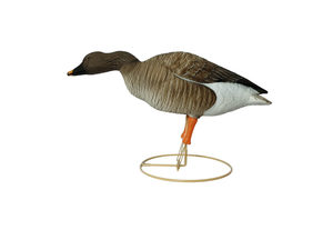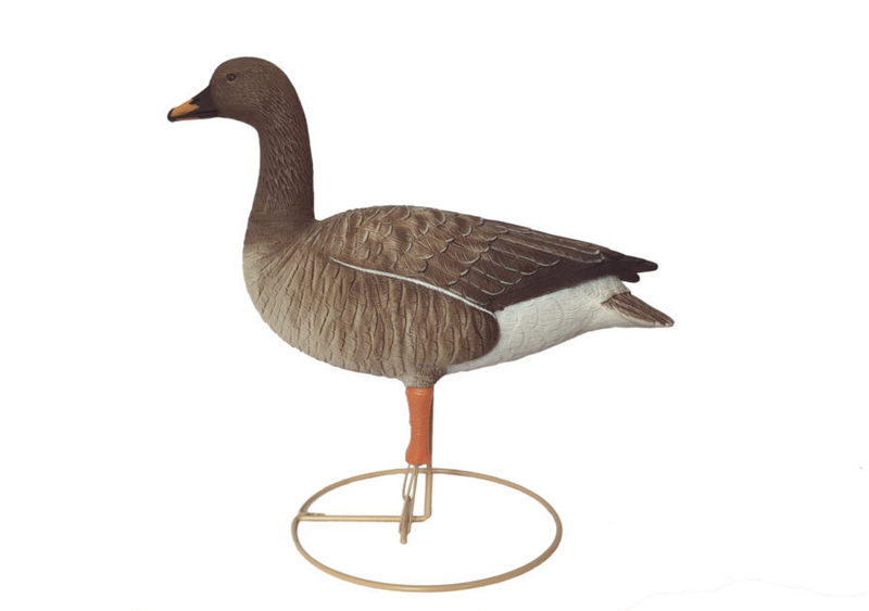 Чучела гуменника 62 breite. Цена за комплект из 6 штук. Головы съемные в 5 разных позах. Головы вставляются в специальный паз на корпусе муляжа и их можно поворачивать, что позволяет создать разнообразную и живописную стаю (например, повернув голову в сторону корпуса можно сделать из кормящегося отдыхающего). Кроме того, со снятой головой чучела гуменника 62 breite занимают меньший объем, что упрощает их хранение и транспортировку. Корпус чучел объемный пустотелый из гибкого пластика. Чучела явлются не сминаемыми, их не нужно распрямлять перед каждой охотой. Они хорошо держат форму, но при этом за счет гибкости материала достаточно прочные. В нижней части чучел две пластиковые оранжевые лапки (без перепонок) с резинкой для фиксации на стойке. Поверхность чучел рифленная с очень качественной покраской матовой не бликующей краской. Покраска детально повторяет внешний вид гуменника, с элементами пера и характерными видовыми признаками. Каждое чучело гуменника 62 breite устанавливается на землю с помощью прочной металлической стойки с круглым основанием. Стойки черного цвета. Для надежного крепления стойки, в корпусе чучел имеется специальный пластиковый паз. Длина корпуса без головы - 48 см. Вес одного чучела без стойки 650-700 грамм. Вес стойки - 320 грамм. Вес собранного чучела на стойке - 1 кг.