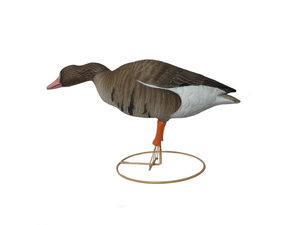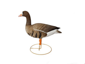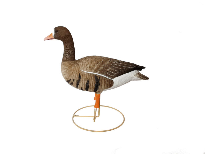 Чучела белолобого гуся 62 breite. Цена за комплект из 6 штук. Головы съемные в 5 разных позах. Головы вставляются в специальный паз на корпусе муляжа и их можно поворачивать, что позволяет создать разнообразную и живописную стаю (например, повернув голову в сторону корпуса можно сделать из кормящегося отдыхающего). Кроме того, со снятой головой чучела белолобого гуся 62 breite занимают меньший объем, что упрощает их хранение и транспортировку. Корпус чучел объемный пустотелый из гибкого пластика. Чучела явлются не сминаемыми, их не нужно распрямлять перед каждой охотой. Они хорошо держат форму, но при этом за счет гибкости материала достаточно прочные. В нижней части чучел две пластиковые оранжевые лапки (без перепонок) с резинкой для фиксации на стойке. Поверхность чучел рифленная с очень качественной покраской матовой не бликующей краской. Покраска детально повторяет внешний вид гуменника, с элементами пера и характерными видовыми признаками. Каждое чучело белолобика 62 breite устанавливается на землю с помощью прочной металлической стойки с круглым основанием. Стойки черного цвета. Для надежного крепления стойки, в корпусе чучел имеется специальный пластиковый паз. Длина корпуса без головы - 48 см. Вес одного чучела без стойки 650-700 грамм. Вес стойки - 320 грамм. Вес собранного чучела на стойке - 1 кг.