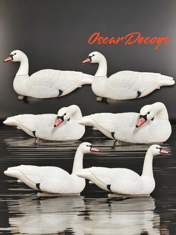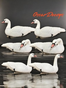 Плавающие чучела белого лебедя Oscar Decoys (Floater Swan) арт.FWG-3D. Комплект из 6 штук: 2 кормящихся, 2 отдыхающих, 2 сторожевых. Чучела объемные пустотелые. Предназначены для установки на воду. Изготовлены из мягкого сминаемого пластика. Головы съемные. В нижней части отгруженный киль с отверстием для шнура. В задней части корпуса чучела лебедя отверстие с заглушкой для поступления воздуха. Рельефная поверхность имитирует перо птицы. Высокое качество изготовления и покраски с детальной прорисовкой пера и характерных видовых признаков. Длина корпуса муляжа - 52 см. Вес 1-го муляжа лебедя Oscar Decoys - 850 грамм.