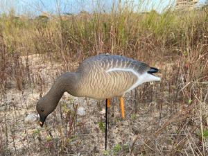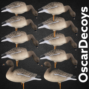 Полевые сминаемые чучела гуся гуменника Oscar Decoys Elite 3D (Bean Goose) арт.EGG10. Предназначены для охоты на гусей. Комплект состоит из 10 штук: 8 кормящихся и 2 спокойных. Чучела объемные пустотелые полнокорпусные. Устанавливаются на поле или болото в местах пролета и кормежки гуменников. Изготовлены из полужесткого сминаемого пластика, который легко принимает и хорошо держит форму чучалок в рабочем виде. В задней части корпуса отверстие в которое можно просунуть руку и расправить муляж. Чучела устанавливаются в землю на стеклопластиковую стойку с фиксатором и заостренным концом. Длина стойки 55 см, вес 35 грамм, цвет черный. В нижней части корпуса чучела два отверстия для съемных оранжевые лапок (без перепонок). Чучела легкие, очень реалистичные и достаточно компактные в сложенном виде. Рельефная 3D поверхность имитирует перо птицы. Высококачественная покраска матовой краской с детальной прорисовкой пера и характерных видовых признаков. Чучела не блистят. Вес одного чучела без стойки 320-350 грамм. Длина кормящегося муляжа - 61 см, спокойного - 53 см. Это размер среднего гуся гуменника. В задней части чучалки имеется кольцо для крепления шнура.
