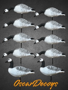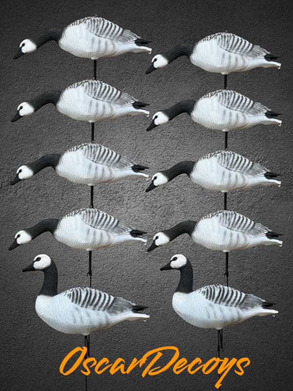 Полевые сминаемые чучела казарки Oscar Decoys King Custom (Barnacles) арт.BG10. Модель 2024 года увеличенного размера. Предназначены для охоты на белощекую казарку. Комплект состоит из 10 штук: 8 кормящихся и 2 активных. Чучела объемные пустотелые полнокорпусные. Предназначены для установки на поле или болото в местах пролета и кормежки гусей. Изготовлены из полужесткого сминаемого резинопластика, который легко принимает и хорошо держит форму чучалок в рабочем виде. В задней части корпуса отверстие в которое можно просунуть руку и расправить муляж. Чучела устанавливаются в землю на стеклопластиковую стойку с фиксатором и заостренным концом. Длина стойки 55 см, вес 30 грамм, цвет черный. В нижней части корпуса есть клеймо Oscar Decoys. В отверстия для лапок установлен оранжевый шнур диаметром 6 мм, который имитирует гусиные лапы. Шнур хорошо заметен, закреплен на чучелах, не теряется и не требует снятия/установки. Чучела Oscar Decoys King Custom крупные, очень реалистичные, хорошо заметны и абсолютно не отличимы от живых гусей даже с близкого расстояния. Рельефная 3D поверхность имитирует перо птицы. Высококачественная покраска матовой не бликующей краской с детальной прорисовкой пера и характерных видовых признаков). Вес одного чучела без стойки 480-500 грамм. Длина кормящегося муляжа - 67 см. По размеру они сопоставимы с крупным гусем весом 3-4 кг. В задней части чучалки имеется кольцо для крепления шнура.