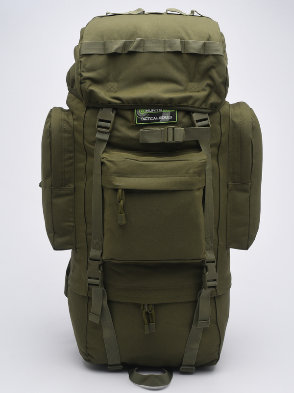Один карман на молнии на передней части рюкзака. Два вертикальных кармана с двойными молниями по бокам рюкзака. В верхней и нижней части рюкзака имеются ручки для переноски. В нижней части рюкзак оборудован ремнями с утяжкой и стропами Molle для крепления каремата и дополнительного снаряжения.