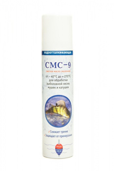 Пищевая смазка СМС-9 (светлое смазочное масло) предназначено для обработки рыболовной лески, мушек и катушек. Защищает рыболовные снасти от трения, обледенения и смерзания при рабочей температуре от - 40 до + 270 С. Выпускается в аэрозольной упаковке объемом 110 мл. Активатор (кнопка) имеет впрессованную трубочку для экономичного нанесения смазки в труднодоступные места. Не имеет запаха и вкуса. Вес - 85-90 грамм.