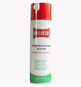 Универсальное многоцелевое оружейное масло для ухода и чистки оружия Ballistol spray 400 мл. Масло оружейное Ballistol удаляет налет свинца, меди и томпака со стволов и патронников огнестрельного оружия, защищает деревянные части оружия, очищает, пропитывает и размягчает изделия из кожи (например, ружейные ремни и чехлы), нейтрализует и удаляет кислотные осадки от пороха. Масло Ballistol проверено временем и считается одним из лучших на рынке в среднем ценовом диапазоне и многие охотники в России используют его для чистки своего оружия. Форма выпуска спрей. Спрей значительно облегчает сам процесс ухода за оружием, а также его транспортировку и хранение. В отличие от стандартных флаконов спрей не склонен к опрокидыванию. Чистка оружия с использованием оружейного масла Ballistol spray интуитивно проста: достаточно прыснуть масло в канал ствола и прочистить его металлическим ершом до чистоты. Средство размоет нагар и освинцовку и облегчит процесс чистки. Для смазки достаточно повторить нанесение.
