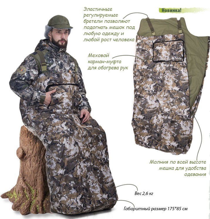 Теплый мешок для охоты с вышки (лабаза). Одевается поверх одежды для сохранения тепла. По конструкции напоминает спальный мешок и помогает охотнику легче переносить холод в ожидании зверя. Особенно это актуально при охоте с лабаза зимой, когда даже хорошая зимняя одежда и обувь не всегда спасают от холода. Ждать зверя (как правило это кабан) иногда приходится очень долго и шевелиться нельзя. Именно для таких охот и создана данная индивидуальная засидка. Мешок сохраняет тепло вокруг тела, не позволяет мерзнуть ногам и обеспечивает необходимый уровень комфорта в течении длительного времени.