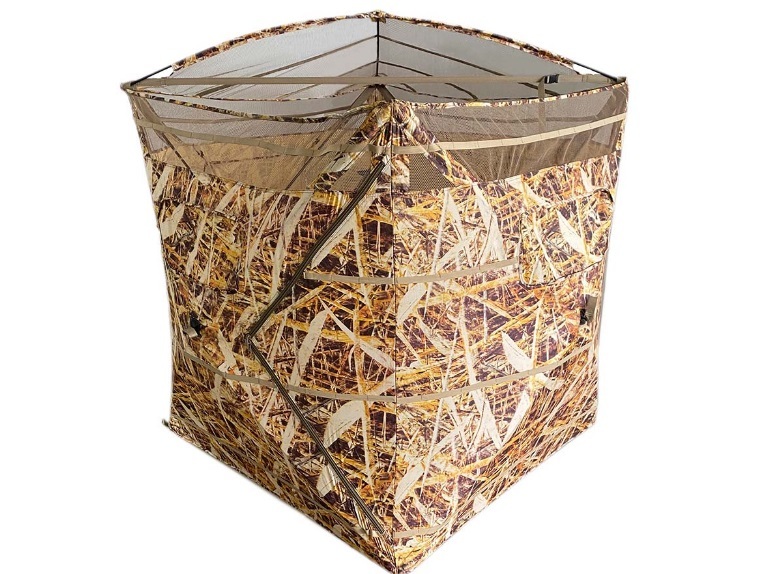 Засидка для охоты ShotTime Куб цвет камыш арт.ST-TB-01. Рекомендуется для охоты на гуся и утку. Подходит для комфортного размещения двух охотников. Быстросборная конструкция состоящая из 4-х стенок обеспечивает обзор на 360 градусов. Легко собирается и устанавливается на месте охоты. Изготовлена из ткани Оксфорд 300D с водоотталкивающей пропиткой. По периметру засидки нашиты стропы для крепления дополнительной маскировки из веток и травы. Вход в стене закрывается на молнию. В стенках окна-бойницы, которые закрываются клапанами. В комплекте чехол с лямками для переноски. Размер в рабочем состоянии: 145х145х168 см. Размер в собранном состоянии: 110х18х18 см. Вес - 6 кг. Цвет камыш.