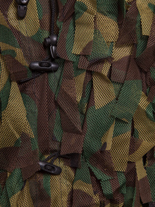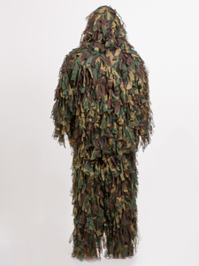 Костюм состоит из 2-х частей: штаны и куртка.На все детали костюмы нашито большое количество полосок из основной ткани (сетка трикотажная), которые шевелится на ветру и при движении маскирующегося, что оптически деформирует силуэт человека и создает эффект объемного камуфляжа, затрудняя распознование и обнаружения объекта. Материал - сетка трикотажная. Застежка куртки центральная, сквозная на навесные петли и пуговицы-палочки. Рукава куртки плотно облегают запястья за счет эластичной резины. Пояс и низки брюк также на эластичной резине. На куртке имеется капюшон с утяжкой и сеткой на лицо.