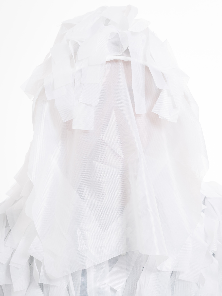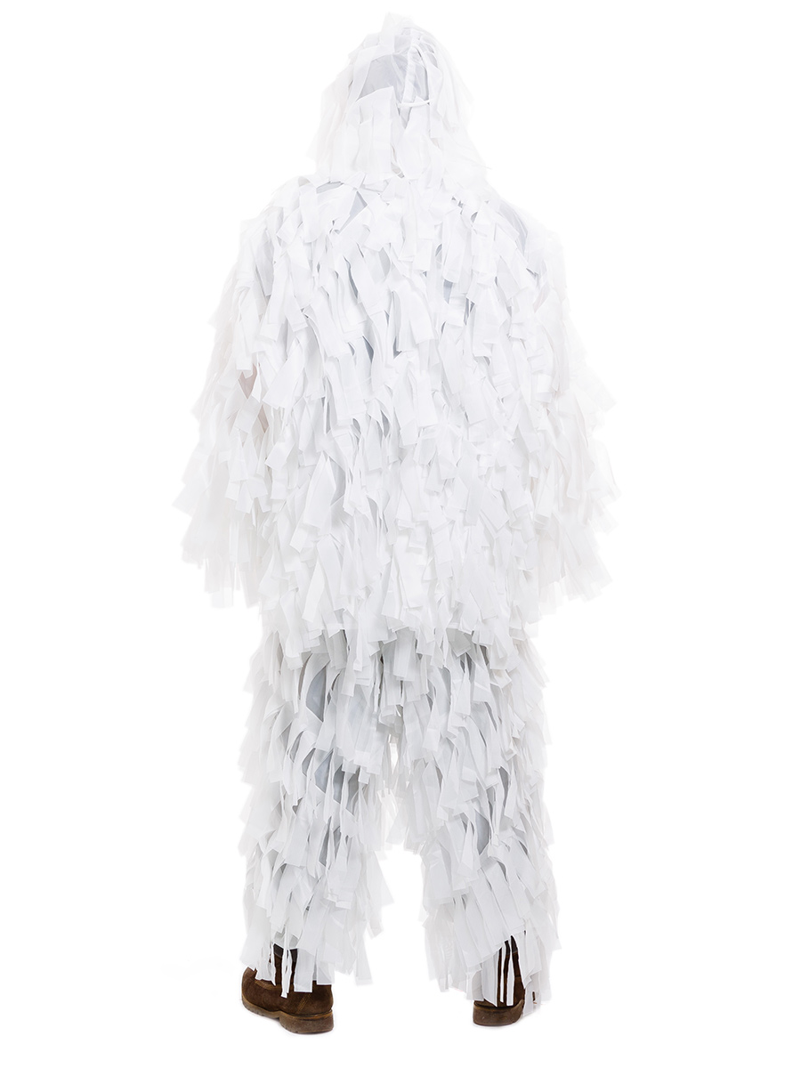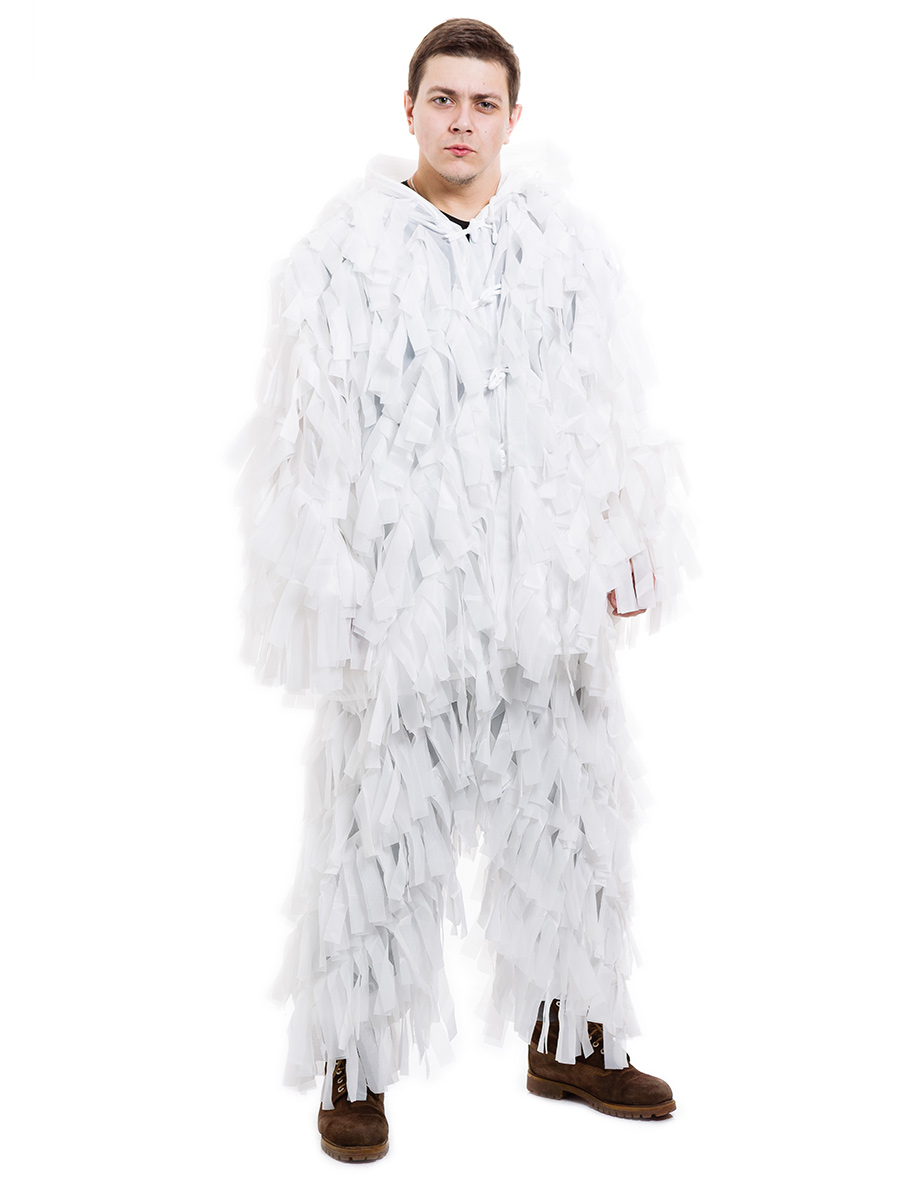 Костюм для маскировки в зимний период с эффектом объемной маскировки. Цвет костюма - белый. Костюм легкий, "дышит", не шуршит. Материал - трикотажное полотно (нейлон). Большое кол-во лоскутов материала по всему костюму размывают контуры тела человека и делает его невидимым для птиц, зверей, людей. Куртка с центральной застежкой на навесные петли и пуговицы- палочки. Рукава по низу плотно облегают запястье за счет эластичной тесьмы. На куртке имеется капюшон, по переднему краю которого расположена накидка, маскирующая лицо. Пояс и низки брюк на резине.