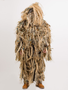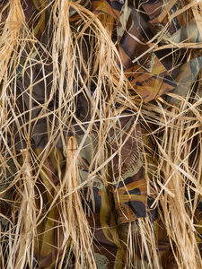 Маскировочный халат "Шаман" с натуральным лыком. Одевается поверх основной одежды. Халат с рукавами, капюшоном и накидкой на лицо. Цветовое исполнение - "камыш". Преобладающие цвета желтый,серый и коричневый. Основной материал халата - Taffeta подкладочная, за счет чего халат не только маскирует, но и защищает от ветра и холода, в отличие от других костюмов и халатов, основной которых является трикотажная сетка. По всей поверхности халата нашито большое количество "кусков" из полос синтетического материала (трикотажное полотно) и пучков натурального лыка, которые шевелятся на ветру и при движении маскирующегося, что оптически деформирует силуэт человека и создает эффект объемного камуфляжа, затрудняя распознование и обнаружения объекта. Элементы из натурального лыка максимально приближают охотника к окружающей среде и блокируют запах человека. Застежка халата центральная на навесные петли и пуговицы-палочки. Имеет регулировку длины, при помощи шнуров-кулис с фиксаторами. Капюшон с накидкой для лица по переднему краю. На концах рукавов халата эластичные резинки. Вес халата - 1050-1150 грамм.