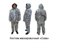 Костюм маскировочный зимний предназначен для маскировки в зимний период. Костюм одевается поверх основной одежды. Цветовое оформление костюма "Сова". Материл - ткань Taffeta 190. Костюм состоит из: куртка, брюки и компактный мешок для переноски. Застежка куртки центральная сквозная на молнию. На талии прорези (2 шт) для входа в карманы нижнего слоя одежды. Капюшон с кулисой регулируется по овалу лица. Рукава по низу плотно облегают запястье за счет эластичной тесьмы. Низ куртки регулируется. Брюки свободного кроя имеют 2 прорези для доступа к карманом нижнего слоя одежды. Пояс и низки брюк стягиваются резиной. Дополнительно брюки фиксируются бретелью наискосок торса.