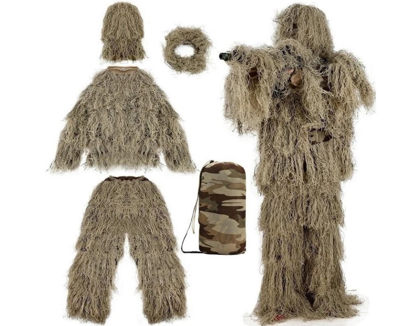 Маскировочный костюм Ghillie. Костюм состоит из 5 предметов: куртка, брюки, капюшон, лента на оружие и мешок для переноски. Легкий маскировочный костюм из синтетической сетчатой камуфлированной ткани с нашитымы пучками синтетической нити. Костюм отлично "размывает" фигуру человека, не имеет запаха, не осыпается, не шуршит и не бликует. Основа костюма - сетчатая ткань - хорошо пропускает воздух. Куртка имеет центральную застежку на пуговицы. Брюки утягиваются по талии. Рукава и низ брюк на резинке. Капюшон имеет сетку, закрывающую лицо. Полоска ткань с нитью из комплекта предназначена для обертывания оружия с целью минимизации бликов. Вес - 1150 грамм. Цвет: Desert. Размер в мешке: 38х21 см.