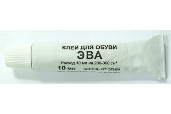 Клей для обвуви ЭВА. Объем 10 мл. Специальный клей именно для материала ЭВА (этиленвинилацетета). Клей имеет желтоватый оттенок. Эластичность, водостойкость и морозостойкость делают этот клей наиболее эффективным для ремонта ЭВА обуви. Расход 10 мл на 200-300 см.кв. Клей не подходит для склеивания изделий из ПВХ.