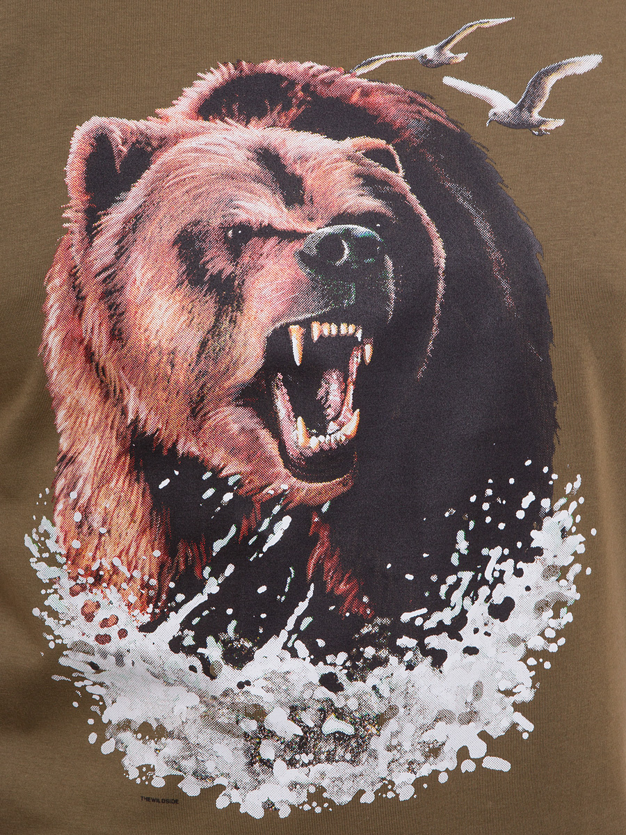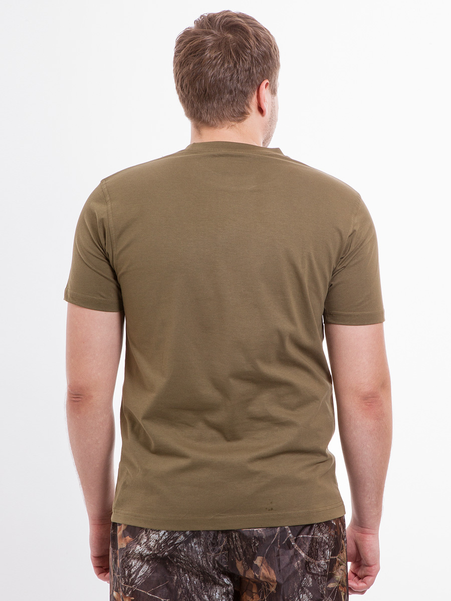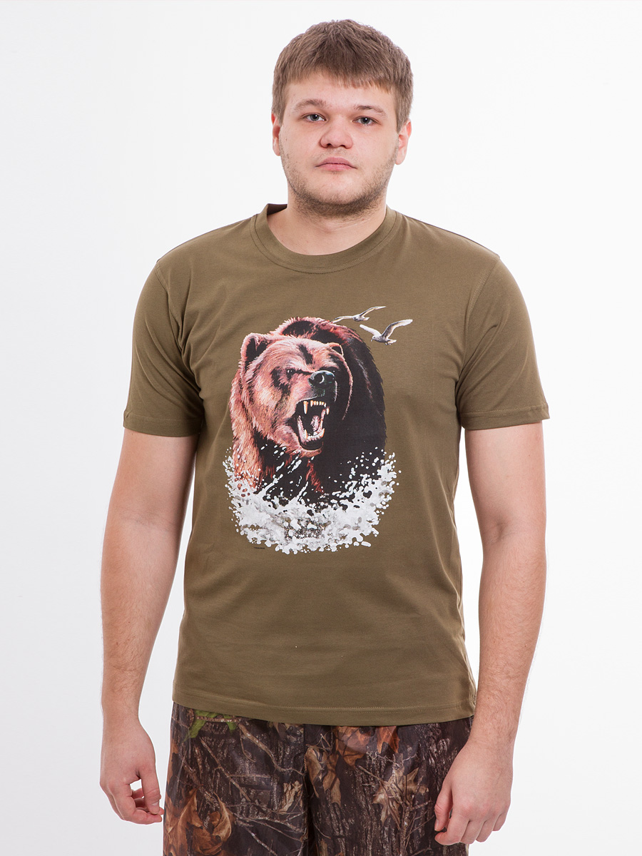 Классическая футболка цвета "хаки" серии "Рыбалка и охота" с рисунком на груди. Футболки изготавливаются с использованием первосортной хлопчатобумажной пряжи, прядильных машин высокого класса при постоянном контроле качества изделий. Полотно проходит специальную обработку для придания ему особой мягкости и шелковистости. Воротник не деформируется в процессе носки за счет эластичности, обеспечиваемой технологии вязки переплетением "ластик" высокого класса. Материал - 100% хлопок. На лицевой части футболки, методом термопечати нанесено оригинальное изображение. Футболки прекрасно носятся, сохраняют форму, цвет и не линяют даже при многократной стирке.Поставляется в фирменной упаковке. В ассортименте имеются футболки размеров: 46-54.