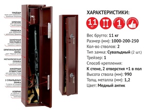 Сейф оружейный S1 предназначен для хранения гладкоствольного и нарезного (охотничьего/служебного) оружия и полностью соответствует требованиям МВД к хранению оружия и правилам оборота гражданского и служебного оружия и патронов к нему. Максимальное количество ружей, которое можно разместить в сейфе - 2 единицы. Максимальная высота ружей - 990 мм. Сейфы изготовлены из стали толщиной 1,2 мм и имеют оригинальный окрас "медный антик". Каждый сейф имеет ящик для отдельного хранения патронов (трейзер), который запирается на почтовый замок. Запирание двери сейфа осуществляется на 2 сувальдных замка типа "Просам" повышенной секретности. Конструкция шкафа позволяет ставить стволы на всю высоту, т.к. за трейзером есть ниша.