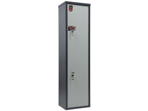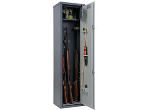 Оружейный сейф AIKO Беркут 143KL. Предназначен для хранения огнестрельного оружия. Сейф соответствуют требованиям ст.59 Постановления правительства РФ №814 от 21 июля 1998 года "О мерах по регулированию гражданского и служебного оружия и патронов к нему на территории РФ". Сейф рассчитан на хранение до 4-х стволов с максимальной высотой 1370 мм. Есть трейзер для хранения патронов и полки в двери. Комплектуется двумя ключевыми замками. Толщина стенок и лицевой панели 2 мм.