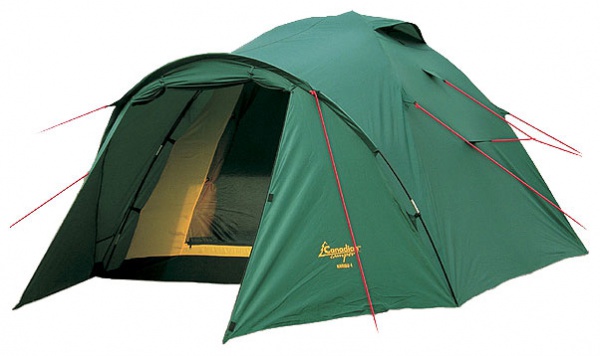 Палатка кемпинговая четырехместная.Тип каркаса - внутренний. Одна комната, два входа, один тамбур. Есть антимоскитная сетка, 2 вентиляционных окна,защита от ультрафиолета, внутренние карманы и крепление фонарика.Швы проклеенные.Огнеупорная пропитка.Дуги стеклопластиковые.Водостойкость тента - 3000 мм.Вес-5,2 кг. Цвет - woodland (зеленый).