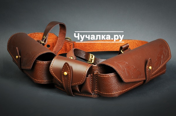 Патронташ на 40 патронов 12 калибра. 3 закрытые секции: 2 секции на 18 патронов (2 ряда по 9) и 1 секция на 4 патрона. Материал - натуральная кожа. Патронташ фиксируется на охотнике на 2 ремня: один регулируемый по длине на шею, 2-ой поясной не регулируемый, длиной 145 см. На ремне патронташа имеется 2 крючка по краям для подвешивания дичи. Цвет - темно-коричневый. Вес - 700-750 грамм.