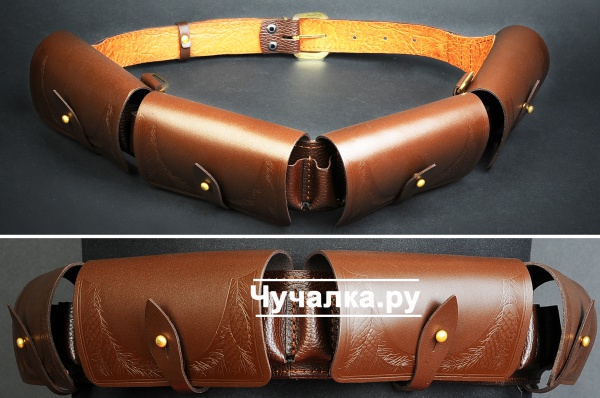Патронташ закрытый на 24 патрона 12 калибра. 4 закрытых несъемных подсумка конструктивно объединенных с поясным ремнем. Каждый подсумок вмещает 6 патронов 12 калибра (в один ряд). Сверху подсумки закрываются клапанами с застежкой на шпенек. Патронташ изготовлен из натуральной кожи темно-коричневого цвета. Подклад (внутренняя часть подсумков и ремня) из кожезаменителя. Качественный и надежный пошив. На лицевой части подсумков декоративное тиснение. Общая длина ремня патронташа - 132 см, ширина ремня - 3,5 см. Размер подсумков: 15х8 см. Вес - 470 грамм.