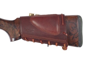Патронташ на приклад на 5 патронов 12 калибра. Патронташ входит в состав коллекции "Хольстер 25 лет". Материал - натуральная кожа премиум класса. Один ряд ячеек под патроны. Патронташ крепится на прикладе кожаной шнуровкой. Шнуровка с тыльной стороны предотвращает нежелательное смещение патронташа вперед относительно приклада. Для дополнительной защиты приклада в момент затяжки под шнуровкой расположен мягкий велюровый клапан. Есть удобный нащечник с мягким наполнителем. Благодаря наличию страховочной планки в нижней части ячейки патрон всегда останется в гнезде даже, если кожа растянется в процессе эксплуатации. Длина патронташа 17 см. Вес патронташа - 190 грамм. Каждое изделие имеет гравировку и упаковано в пропитанную воском бумагу. Цвет - коричневый.