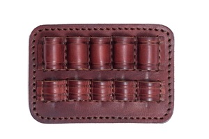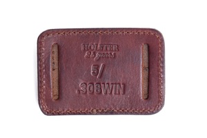 Открытый поясной подсумок из кожи на 5 патронов калибра 308WIN и его аналоги (243WIN, 7мм-08, 260REM, 358WIN) с максимальной длиной патрона до 80 мм. Подсумок входит в состав коллекции "Хольстер 25 лет". Материал - натуральная кожа премиум класса. Один ряд ячеек на 5 патронов. Двухрядная гребенка надежно фиксирует патрон в гнезде. Размеры подсумка: 12х8 см. Подсумок может навешиваться на поясной ремень шириной до 50 мм. Вес подсумка - 60 грамм. Цвет - коричневый. Каждое изделие имеет гравировку и упаковано в пропитанную воском бумагу.