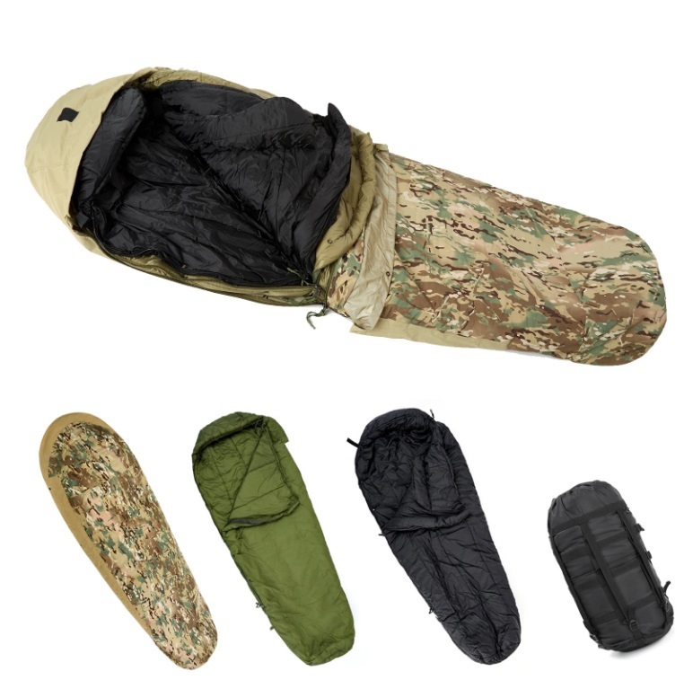 Армейская модульная спальная система Akmax. Армейская модульная спальная система (MSS) была разработана для армии США. Фактически представляет собой всесезонный универсальный спальный мешок типа кокон. В состав модульной спальной системы входит 4 элемента: 2 спальных мешка (зимний и летний), ветро влагозащитный чехол и комрессионный мешок. Все элементы можно использовать по отдельности или вместе, вложив один в другой. За счет многослойности, модульную спальную систему можно использовать как летом, так и зимой при самых низких температурах (до -30 С). Спальные мешки вкладываются один в другой и скрепляются между собой кнопками. Надежные двойные молнии с правой стороны под защитными планками. Широкий подголовник обеспечивает комфорт для головы и сохранение тепла. Внешний мешок Bivy Cover изготовлен из прочного нейлона, устойчивого к механическим повреждениям. Он защищает от ветра и влаги. В качестве утеплителя в данной модульной спальной системе используется Polarguard HV, который обладает отличными характеристиками и устойчив к сжатию. Компрессионный мешок изготовлен из прочного нейлона и имеет стропы для утяжки по периметру. Размеры: 220х90х71 см. Вес: 4900 грамм. Цвет: Multicam.