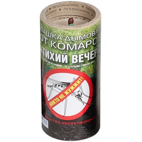 Шашка дымовая "Тихий вечер" предназначена для защиты от комаров и других насекомых. Дым, выделившийся при тлении одной шашки на открытой местности (вне помещений), при слабом ветре распространяется на площади около 100 м.кв. Обладает острым инсектицидным действием в отношении тараканов, клопов, блох, моли, муравьев, комаров, имаго мух, комаров звонцов, комплекса "гнуса". Обеспечивает гибель насекомых в течении 5-120 минут, в зависимости от вида. Обладает остаточной активностью до 14 суток (срок наблюдения). Область применения: населением в быту, для обработки помещений, садовых участков, приусадебных территорий, а также туристами, охотниками, рыболовами для обработки участков природы. Состав: действующее вещество - перметрин - 10%. Срок годности - 3 года со дня изготовления. Размер шашки: 10х4,5 см. Вес - 130 грамм.