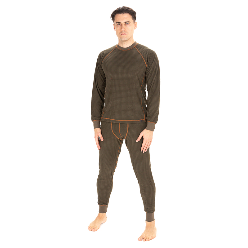 Мужское флисовое термобелье Huntsman ThermoLine предназначено для использования в критически низких температурах до - 40°С. Удерживает до 85 % полезного тепла и эффективно отводит избыточную влагу от кожи во внешние слои одежды. Гипоаллергенно. Уникальная технология без внутреннего шва обеспечивает комфортную носку. Изготовлено из флиса плотностью 160 гр/м2. Комплект состоит из: кальсоны и фуфайка с длинным рукавом. Молнии нет. Фактурное исполнение - вся поверхность термобелья разделена на квадратики. Цвет - хаки.