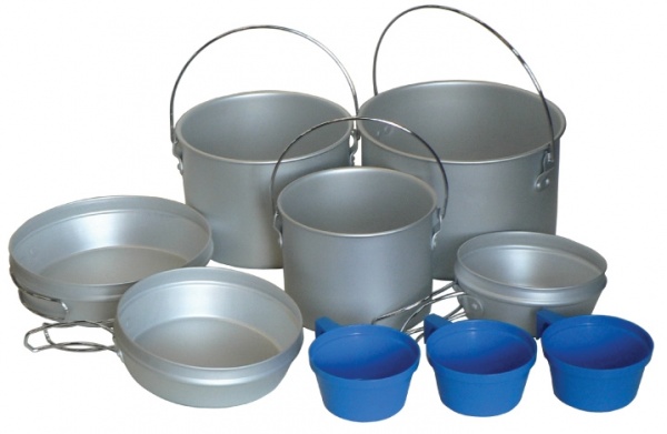 Комплект посуды для приготовления пищи в походных условиях. Материал - алюминий. Комплект состоит из 3-х котелков, 3-х сковородок (они же крышки для котелков) и 3-х пластмассовых кружек, упакованных в мешок для переноски из синтетической ткани.