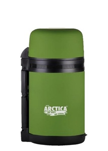 Универсальный термос Арктика (ARCTICA) объемом 1 л. Термос бытовой, вакуумный, с широким горлом для супов, напитков и горячих блюд и двойной пробкой. Изготовлен из пищевой нержавеющей стали 18/8 и пищевой пластмассы. Емкость термоса Арктика - 1000 мл. Корпус имеет прорезиненное покрытие (напыление). Ручка на корпусе для удобного захвата в руке. В комплекте дополнительная чашка и съемный ремешок для переноски. Время сохранения тепла и холода - 20 часов. Цвет - зеленый (болотный). Диаметр донышка - 120 мм. Высота - 230 мм. Диаметр горла - 70 мм. Вес в коробке - 780 грамм. Гарантия прозводителя - 1 год.