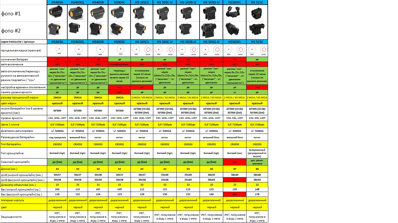 Сравнительная таблица коллиматоров Holosun серии PARALOW: