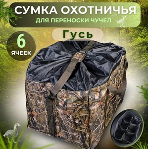 Сумка охотничья для переноски чучел гусей. Сумка предназначена для переноски 6 объемных полнокорпусных или сминаемых гусиных чучел. Сумка прямоугольной формы с 6 отдельными ячейками размером 25х25 см. Есть 2 ручки и съемный регулируемый плечевой ремень с мягкой вставкой. Сумка для чучел изготовлена из плотной ткани Oxford. Внутренние ячейки и верхний клапан из нейлона. Снизу сумки сетка для отвода влаги и вентиляции. Верх закрывается клапаном и утягивается шнуром. Размер сумки: длина 75 см, ширина 50 см, высота 77 см . Вес - 1050 грамм. Цвет - осока.