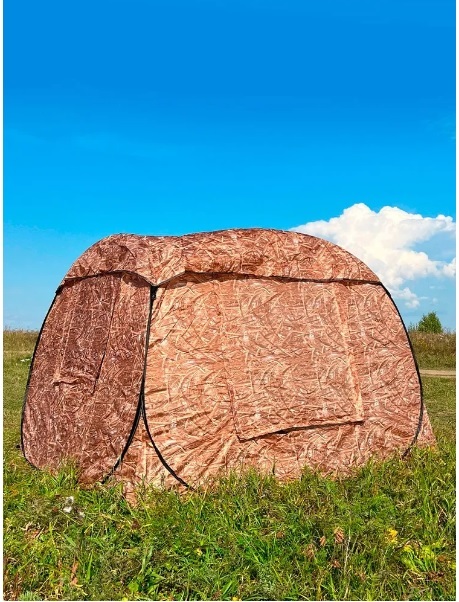 Засидка автомат (скрадок) для охоты на гуся и утку. Автоматическая быстроразборная конструкция. Собирается одним человеком за пару минут. Засидка имеет два входа и 2 больших окна. Дна нет, верх съемный. Размер засидки в разобранном виде 190х190х135 см, что позволяет свободно разместиться 2 охотникам. Стенки и крыша изготовлены из непродуваемой ткани оксфорд (ткань шуршит). Цвет - камыш. По периметру нашита ткань для крепления местной растительности. Упаковывается в чехол на молнии с лямками для переноски за спиной. Габариты в собранном виде: 65х65х5 см. Вес в чехле 3,4 кг. В комплекте шнур и колья для крепления к земле.